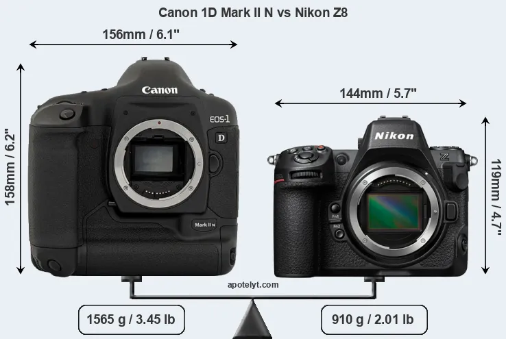 The side-by-side display below illustrates the physical size and weight of the Canon 1D Mark II N and the Nikon Z8. The two cameras are presented according to their relative size. Three consecutive views from the front, the top, and the rear side are shown. All width, height and depth measures are rounded to the nearest millimeter.