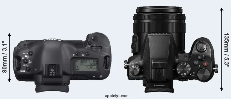 The physical size and weight of the Canon 1D Mark II N and the Panasonic FZ2000 are illustrated in the side-by-side display below. The two cameras are presented according to their relative size. Three successive views from the front, the top, and the rear are shown. All width, height and depth measures are rounded to the nearest millimeter.
