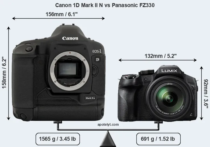 An illustration of the physical size and weight of the Canon 1D Mark II N and the Panasonic FZ330 is provided in the side-by-side display below. The two cameras are presented according to their relative size. Three successive views from the front, the top, and the rear are shown. All width, height and depth dimensions are rounded to the nearest millimeter.