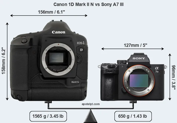 An illustration of the physical size and weight of the Canon 1D Mark II N and the Sony A7 III is provided in the side-by-side display below. The two cameras are presented according to their relative size. Three consecutive perspectives from the front, the top, and the back are available. All size dimensions are rounded to the nearest millimeter.
