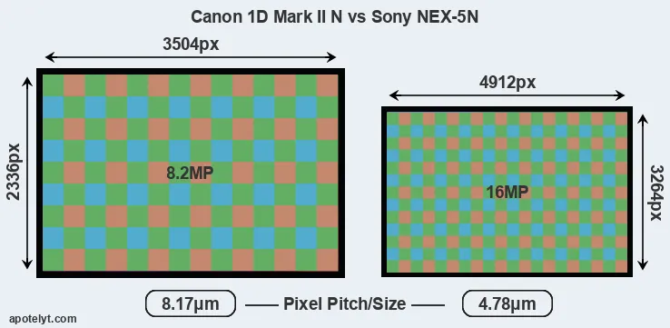 Despite having a smaller sensor, the NEX-5N offers a higher resolution of 16 megapixels, compared with 8.2 MP of the 1D Mark II N. This megapixels advantage comes at the cost of a higher pixel density and a smaller size of the individual pixel (with a pixel pitch of 4.78μm versus 8.17μm for the 1D Mark II N). However, it should be noted that the NEX-5N is much more recent (by 6 years) than the 1D Mark II N, and its sensor will have benefitted from technological advances during this time that make it possible to gather light more efficiently.