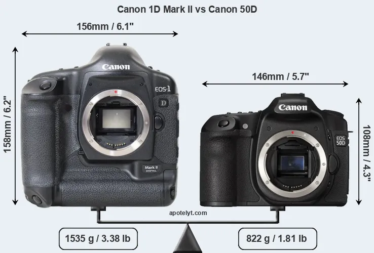 An illustration of the physical size and weight of the Canon 1D Mark II and the Canon 50D is provided in the side-by-side display below. The two cameras are presented according to their relative size. Three consecutive views from the front, the top, and the rear side are shown. All width, height and depth measures are rounded to the nearest millimeter.