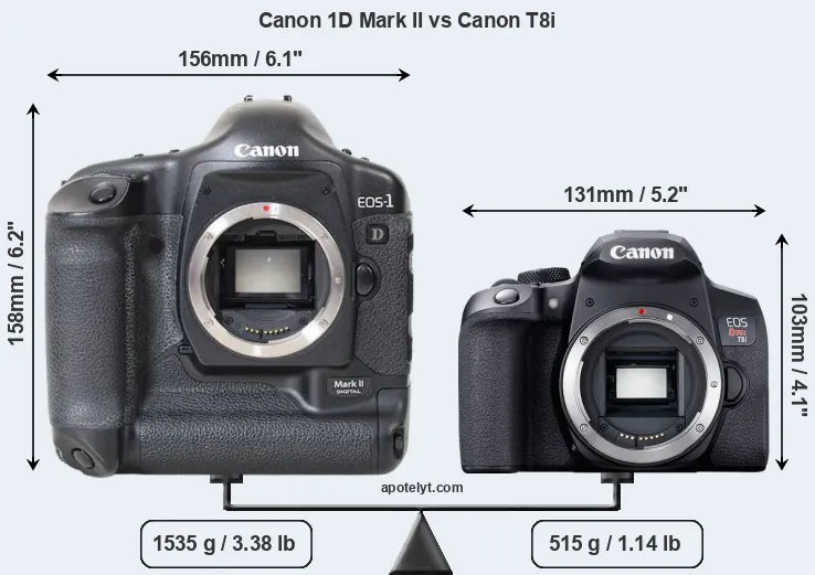The physical size and weight of the Canon 1D Mark II and the Canon T8i are illustrated in the side-by-side display below. The two cameras are presented according to their relative size. Three consecutive views from the front, the top, and the rear side are shown. All width, height and depth dimensions are rounded to the nearest millimeter.