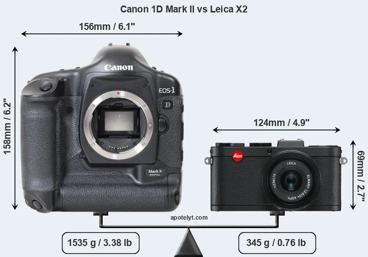 An illustration of the physical size and weight of the Canon 1D Mark II and the Leica X2 is provided in the side-by-side display below. The two cameras are presented according to their relative size. Three consecutive views from the front, the top, and the rear side are shown. All width, height and depth measures are rounded to the nearest millimeter.