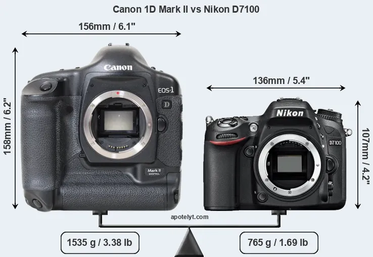 An illustration of the physical size and weight of the Canon 1D Mark II and the Nikon D7100 is provided in the side-by-side display below. The two cameras are presented according to their relative size. Three consecutive perspectives from the front, the top, and the back are available. All width, height and depth measures are rounded to the nearest millimeter.