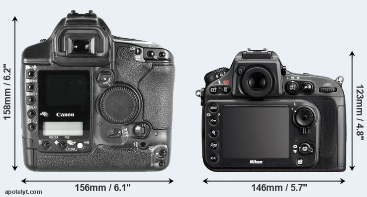 The side-by-side display below illustrates the physical size and weight of the Canon 1D Mark II and the Nikon D800. The two cameras are presented according to their relative size. Three successive views from the front, the top, and the rear are shown. All size dimensions are rounded to the nearest millimeter.