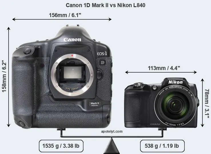An illustration of the physical size and weight of the Canon 1D Mark II and the Nikon L840 is provided in the side-by-side display below. The two cameras are presented according to their relative size. Three consecutive perspectives from the front, the top, and the back are available. All size dimensions are rounded to the nearest millimeter.
