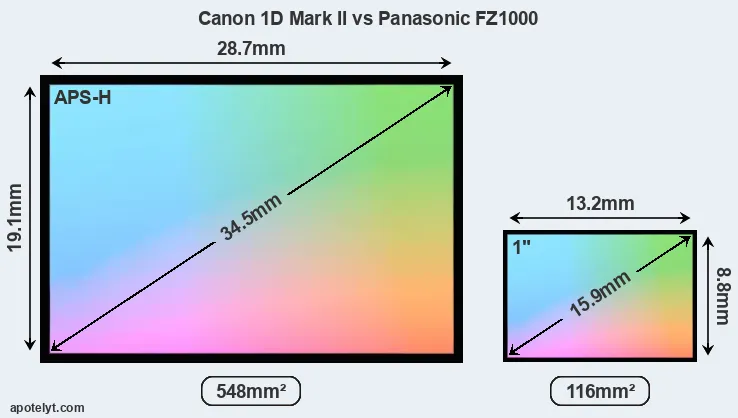 Of the two cameras under consideration, the Canon 1D Mark II features an APS-H sensor and the Panasonic FZ1000 an one-inch sensor. The sensor area in the FZ1000 is 79 percent smaller. As a result of these sensor size differences, the cameras have a format factor of, respectively, 1.3 and 2.7. Both cameras have a native aspect ratio (sensor width to sensor height) of 3:2.