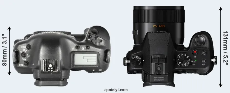 The side-by-side display below illustrates the physical size and weight of the Canon 1D Mark II and the Panasonic FZ1000. The two cameras are presented according to their relative size. Three consecutive views from the front, the top, and the rear side are shown. All width, height and depth dimensions are rounded to the nearest millimeter.