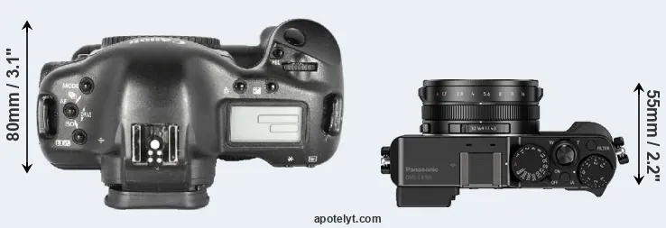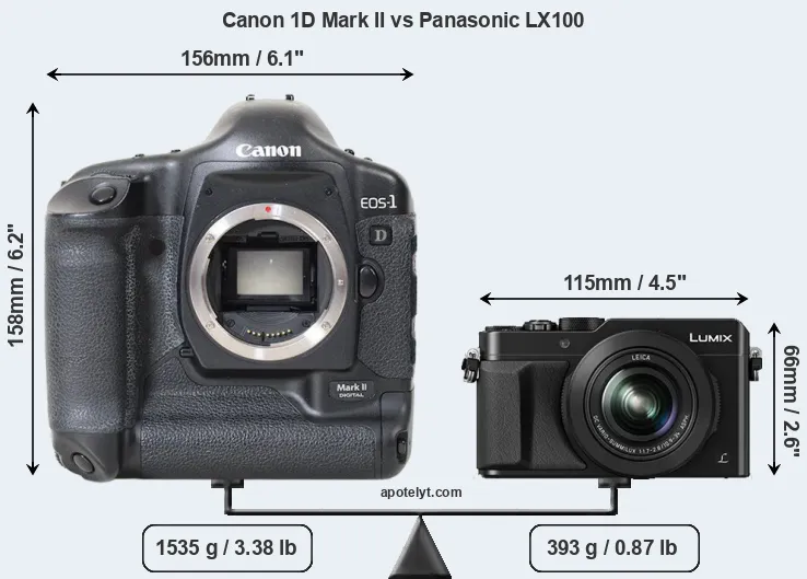 The side-by-side display below illustrates the physical size and weight of the Canon 1D Mark II and the Panasonic LX100. The two cameras are presented according to their relative size. Three consecutive views from the front, the top, and the rear side are shown. All width, height and depth measures are rounded to the nearest millimeter.