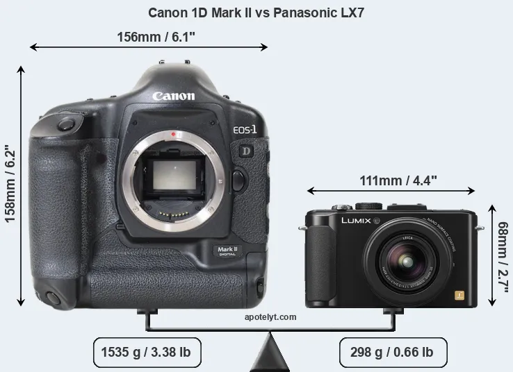 If the front view area (width x height) of the cameras is taken as an aggregate measure of their size, the Panasonic LX7 is considerably smaller (69 percent) than the Canon 1D Mark II. It is worth mentioning in this context that the 1D Mark II is splash and dust resistant, while the LX7 does not feature any corresponding weather-sealing.
