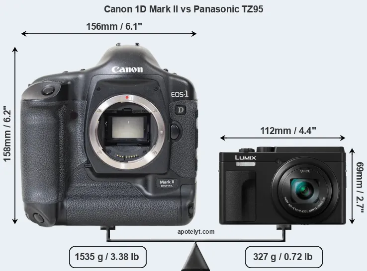 The side-by-side display below illustrates the physical size and weight of the Canon 1D Mark II and the Panasonic TZ95. The two cameras are presented according to their relative size. Three consecutive perspectives from the front, the top, and the back are available. All width, height and depth dimensions are rounded to the nearest millimeter.