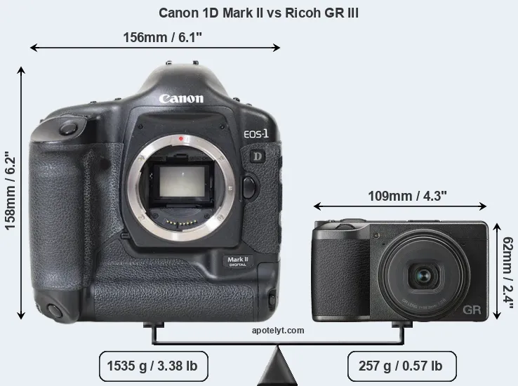 The physical size and weight of the Canon 1D Mark II and the Ricoh GR III are illustrated in the side-by-side display below. The two cameras are presented according to their relative size. Three consecutive perspectives from the front, the top, and the back are available. All width, height and depth measures are rounded to the nearest millimeter.