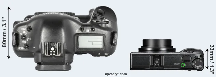 The above size and weight comparisons are to some extent incomplete and possibly misleading, as the GR III has a lens built in, whereas the 1D Mark II is an interchangeable lens camera that requires a separate lens. Attaching the latter will add extra weight and bulk to the setup. You can compare the optics available for the 1D Mark II and their specifications in the Canon EF Lens Catalog.