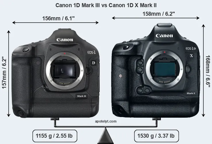 The physical size and weight of the Canon 1D Mark III and the Canon 1D X Mark II are illustrated in the side-by-side display below. The two cameras are presented according to their relative size. Three successive views from the front, the top, and the rear are shown. All width, height and depth measures are rounded to the nearest millimeter.