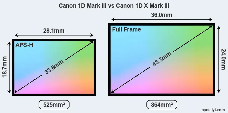 Of the two cameras under consideration, the Canon 1D Mark III features an APS-H sensor and the Canon 1D X Mark III a full frame sensor. The sensor area in the 1DX Mark III is 65 percent bigger. As a result of these sensor size differences, the cameras have a format factor of, respectively, 1.3 and 1.0. Both cameras have a native aspect ratio (sensor width to sensor height) of 3:2.