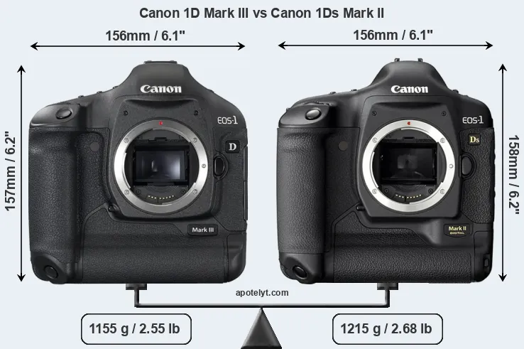 An illustration of the physical size and weight of the Canon 1D Mark III and the Canon 1Ds Mark II is provided in the side-by-side display below. The two cameras are presented according to their relative size. Three consecutive perspectives from the front, the top, and the back are available. All width, height and depth measures are rounded to the nearest millimeter.