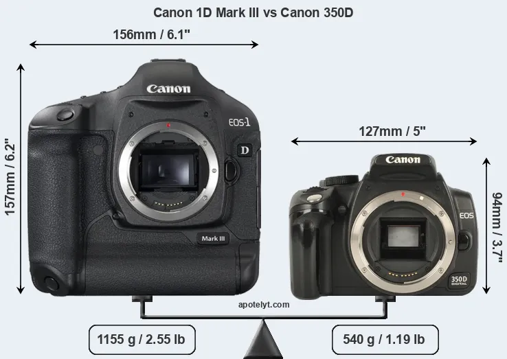 If the front view area (width x height) of the cameras is taken as an aggregate measure of their size, the Canon 350D is considerably smaller (51 percent) than the Canon 1D Mark III. Moreover, the 350D is substantially lighter (53 percent) than the 1D Mark III. It is worth mentioning in this context that the 1D Mark III is splash and dust resistant, while the 350D does not feature any corresponding weather-sealing.