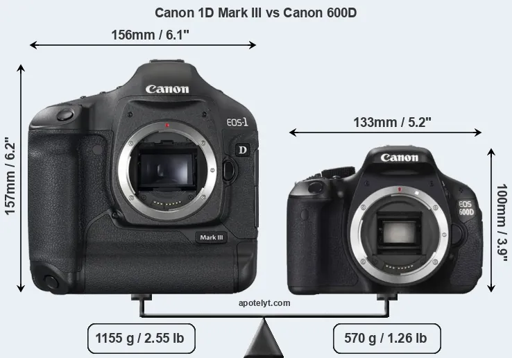 An illustration of the physical size and weight of the Canon 1D Mark III and the Canon 600D is provided in the side-by-side display below. The two cameras are presented according to their relative size. Three consecutive perspectives from the front, the top, and the back are available. All width, height and depth dimensions are rounded to the nearest millimeter.