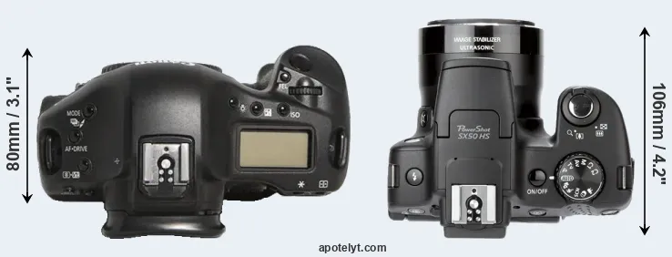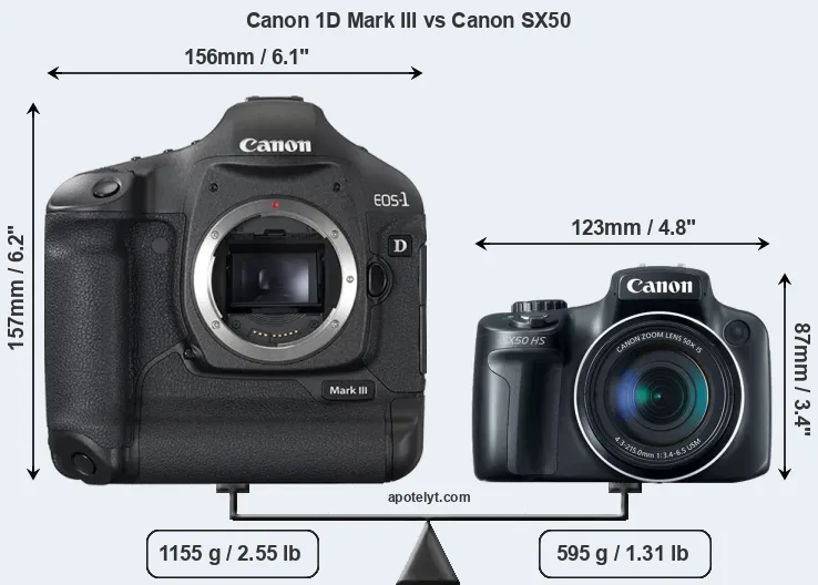 An illustration of the physical size and weight of the Canon 1D Mark III and the Canon SX50 is provided in the side-by-side display below. The two cameras are presented according to their relative size. Three consecutive perspectives from the front, the top, and the back are available. All size dimensions are rounded to the nearest millimeter.