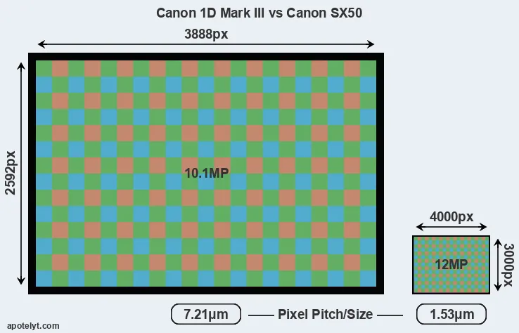 Despite having a smaller sensor, the SX50 offers a higher resolution of 12 megapixels, compared with 10.1 MP of the 1D Mark III. This megapixels advantage comes at the cost of a higher pixel density and a smaller size of the individual pixel (with a pixel pitch of 1.53μm versus 7.21μm for the 1D Mark III). However, it should be noted that the SX50 is much more recent (by 5 years and 6 months) than the 1D Mark III, and its sensor will have benefitted from technological advances during this time that make it possible to gather light more efficiently.