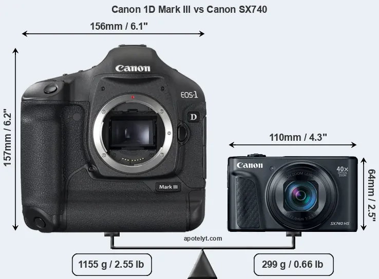 The physical size and weight of the Canon 1D Mark III and the Canon SX740 are illustrated in the side-by-side display below. The two cameras are presented according to their relative size. Three consecutive perspectives from the front, the top, and the back are available. All width, height and depth dimensions are rounded to the nearest millimeter.