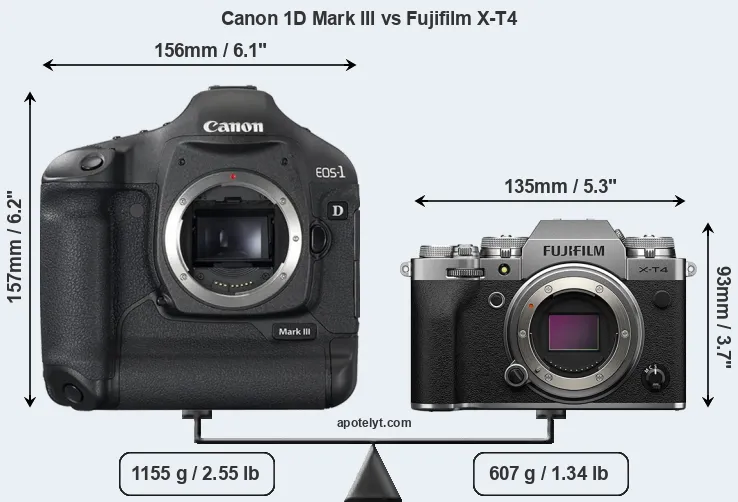 An illustration of the physical size and weight of the Canon 1D Mark III and the Fujifilm X-T4 is provided in the side-by-side display below. The two cameras are presented according to their relative size. Three successive views from the front, the top, and the rear are shown. All size dimensions are rounded to the nearest millimeter.