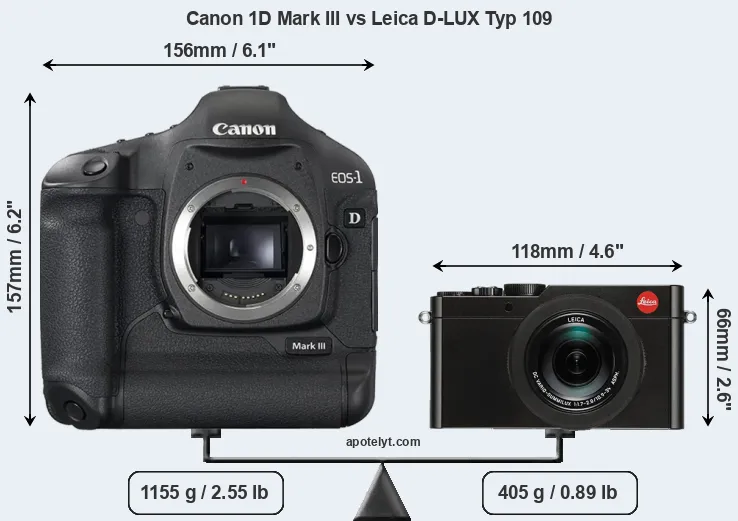 The side-by-side display below illustrates the physical size and weight of the Canon 1D Mark III and the Leica D-LUX Typ 109. The two cameras are presented according to their relative size. Three consecutive perspectives from the front, the top, and the back are available. All size dimensions are rounded to the nearest millimeter.