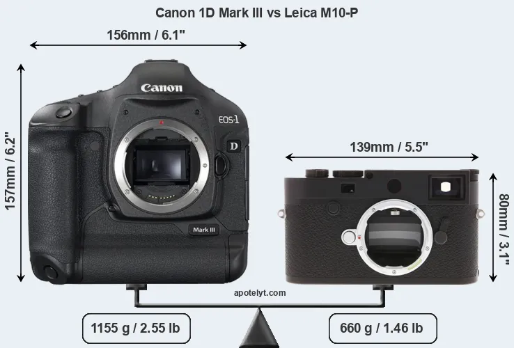 The side-by-side display below illustrates the physical size and weight of the Canon 1D Mark III and the Leica M10-P. The two cameras are presented according to their relative size. Three consecutive perspectives from the front, the top, and the back are available. All width, height and depth measures are rounded to the nearest millimeter.