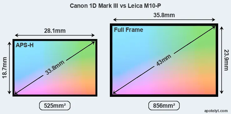 Of the two cameras under consideration, the Canon 1D Mark III features an APS-H sensor and the Leica M10-P a full frame sensor. The sensor area in the M10-P is 63 percent bigger. As a result of these sensor size differences, the cameras have a format factor of, respectively, 1.3 and 1.0. Both cameras have a native aspect ratio (sensor width to sensor height) of 3:2.