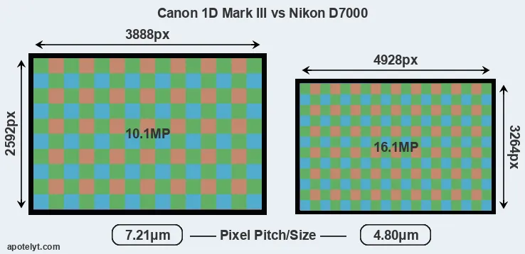 Despite having a smaller sensor, the D7000 offers a higher resolution of 16.1 megapixels, compared with 10.1 MP of the 1D Mark III. This megapixels advantage comes at the cost of a higher pixel density and a smaller size of the individual pixel (with a pixel pitch of 4.80μm versus 7.21μm for the 1D Mark III). However, it should be noted that the D7000 is much more recent (by 3 years and 6 months) than the 1D Mark III, and its sensor will have benefitted from technological advances during this time that make it possible to gather light more efficiently.