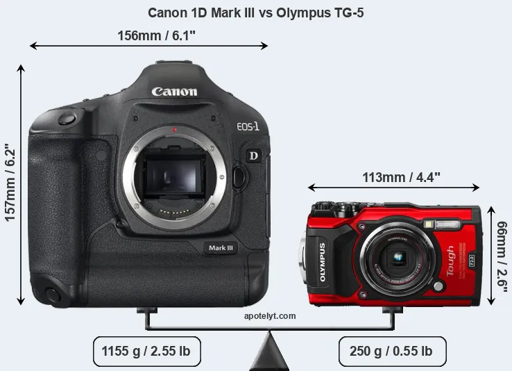 An illustration of the physical size and weight of the Canon 1D Mark III and the Olympus TG-5 is provided in the side-by-side display below. The two cameras are presented according to their relative size. Three consecutive views from the front, the top, and the rear side are shown. All width, height and depth measures are rounded to the nearest millimeter.