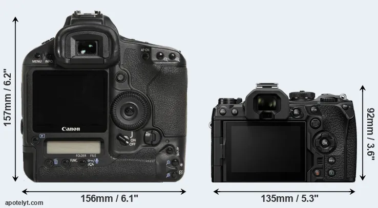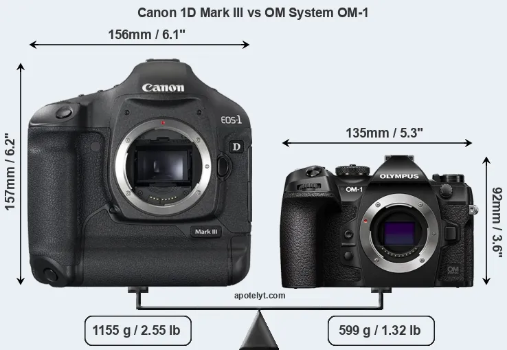 The physical size and weight of the Canon 1D Mark III and the OM System OM-1 are illustrated in the side-by-side display below. The two cameras are presented according to their relative size. Three successive views from the front, the top, and the rear are shown. All width, height and depth measures are rounded to the nearest millimeter.
