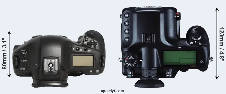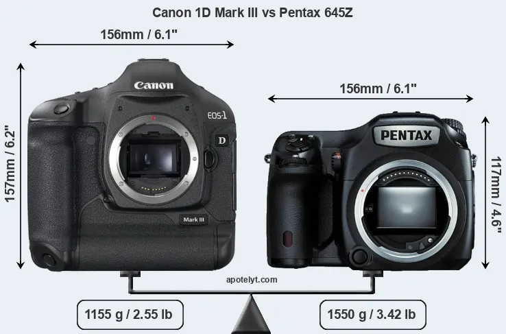 The physical size and weight of the Canon 1D Mark III and the Pentax 645Z are illustrated in the side-by-side display below. The two cameras are presented according to their relative size. Three consecutive views from the front, the top, and the rear side are shown. All size dimensions are rounded to the nearest millimeter.