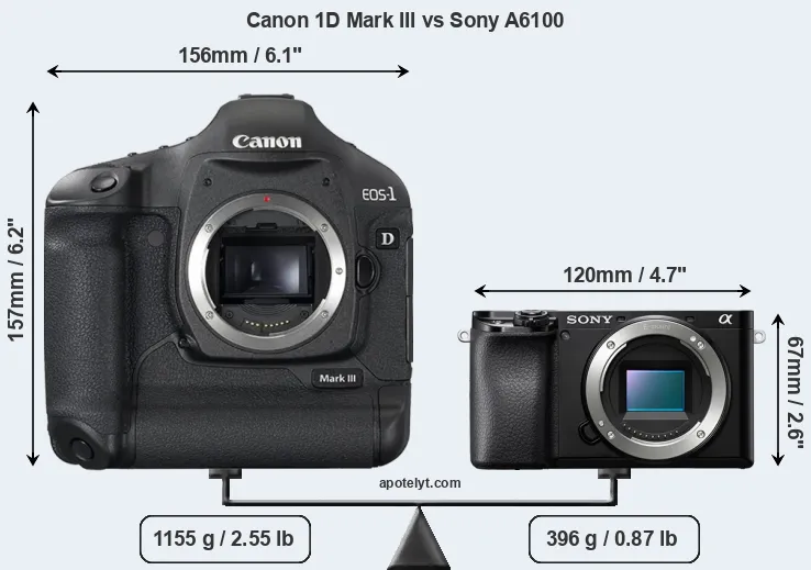 If the front view area (width x height) of the cameras is taken as an aggregate measure of their size, the Sony A6100 is considerably smaller (67 percent) than the Canon 1D Mark III. Moreover, the A6100 is substantially lighter (66 percent) than the 1D Mark III. It is worth mentioning in this context that the 1D Mark III is splash and dust resistant, while the A6100 does not feature any corresponding weather-sealing.