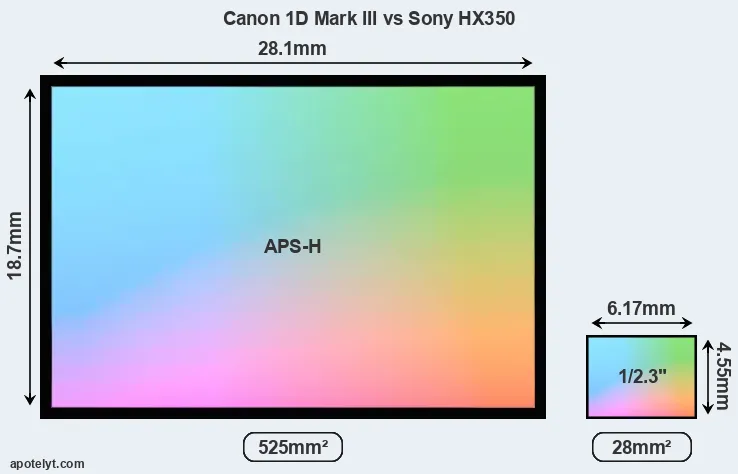 Of the two cameras under consideration, the Canon 1D Mark III features an APS-H sensor and the Sony HX350 a 1/2.3-inch sensor. The sensor area in the HX350 is 95 percent smaller. As a result of these sensor size differences, the cameras have a format factor of, respectively, 1.3 and 5.6. The sensor in the 1D Mark III has a native 3:2 aspect ratio, while the one in the HX350 offers a 4:3 aspect.