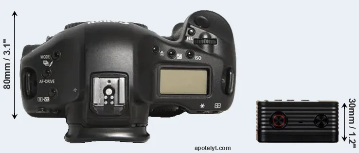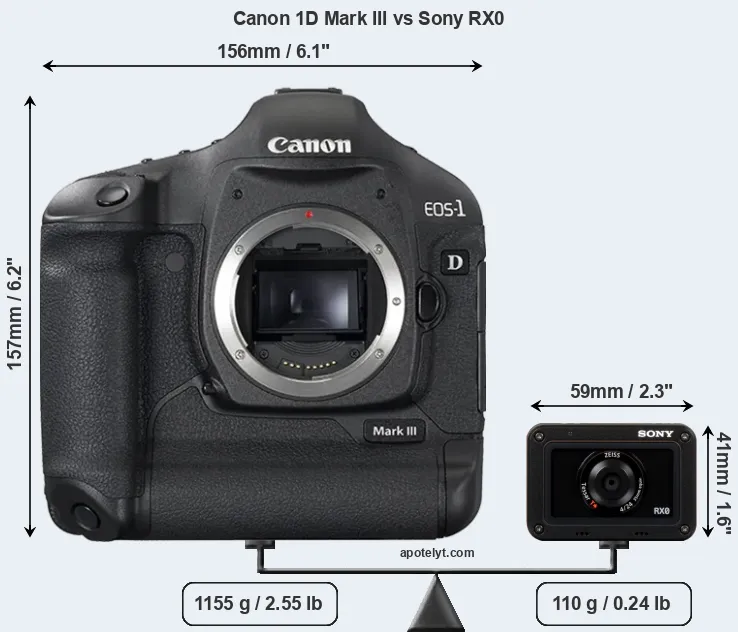The physical size and weight of the Canon 1D Mark III and the Sony RX0 are illustrated in the side-by-side display below. The two cameras are presented according to their relative size. Three successive views from the front, the top, and the rear are shown. All width, height and depth measures are rounded to the nearest millimeter.