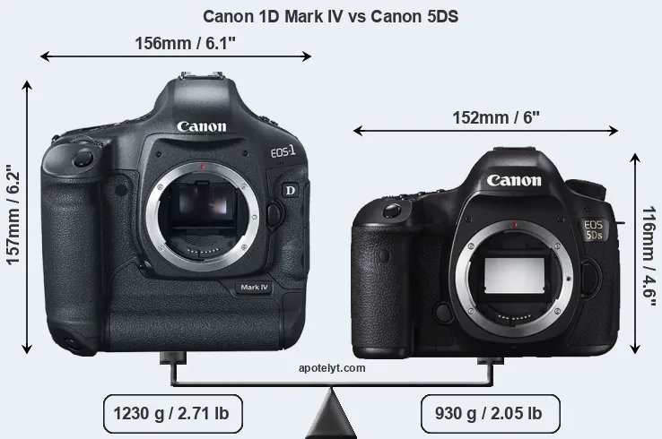 An illustration of the physical size and weight of the Canon 1D Mark IV and the Canon 5DS is provided in the side-by-side display below. The two cameras are presented according to their relative size. Three successive views from the front, the top, and the rear are shown. All width, height and depth measures are rounded to the nearest millimeter.