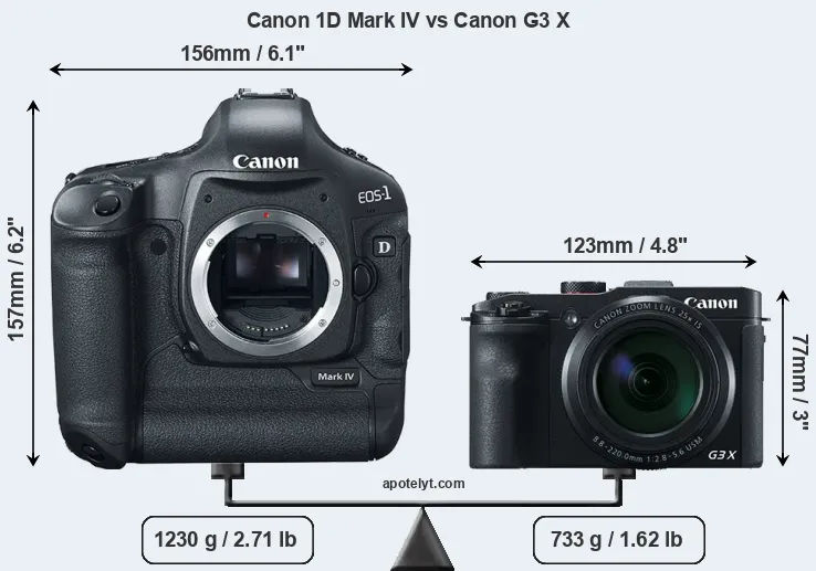An illustration of the physical size and weight of the Canon 1D Mark IV and the Canon G3 X is provided in the side-by-side display below. The two cameras are presented according to their relative size. Three consecutive perspectives from the front, the top, and the back are available. All width, height and depth dimensions are rounded to the nearest millimeter.