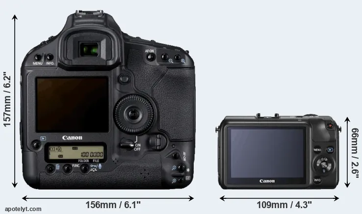 An illustration of the physical size and weight of the Canon 1D Mark IV and the Canon M is provided in the side-by-side display below. The two cameras are presented according to their relative size. Three successive views from the front, the top, and the rear are shown. All size dimensions are rounded to the nearest millimeter.