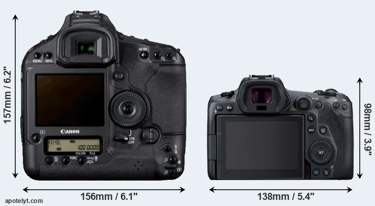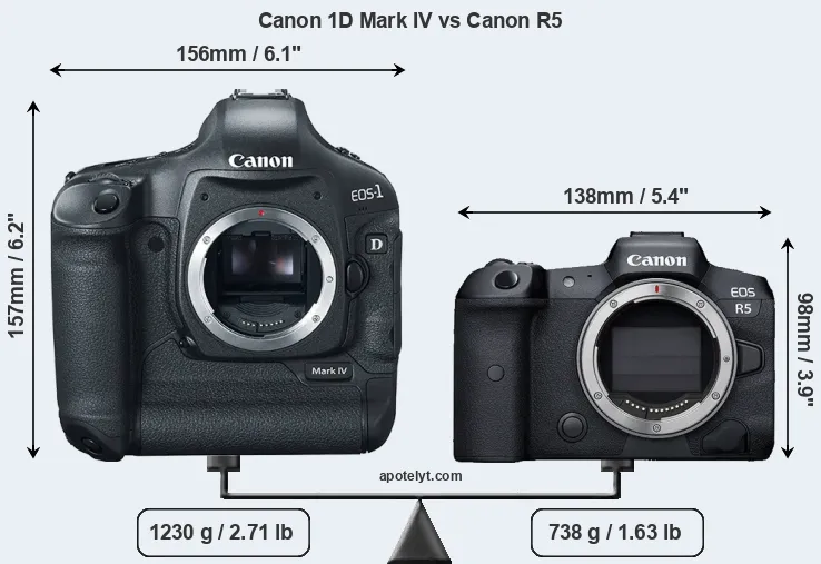 The physical size and weight of the Canon 1D Mark IV and the Canon R5 are illustrated in the side-by-side display below. The two cameras are presented according to their relative size. Three consecutive views from the front, the top, and the rear side are shown. All size dimensions are rounded to the nearest millimeter.
