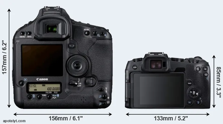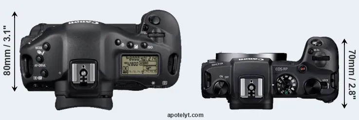 The physical size and weight of the Canon 1D Mark IV and the Canon RP are illustrated in the side-by-side display below. The two cameras are presented according to their relative size. Three successive views from the front, the top, and the rear are shown. All width, height and depth dimensions are rounded to the nearest millimeter.