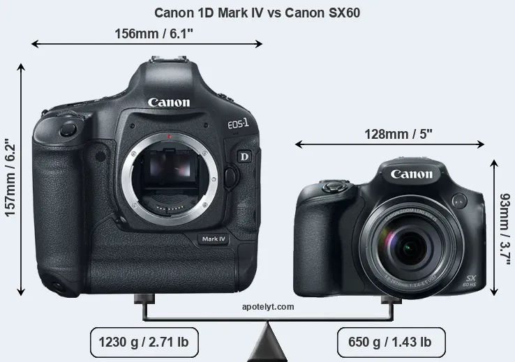 The side-by-side display below illustrates the physical size and weight of the Canon 1D Mark IV and the Canon SX60. The two cameras are presented according to their relative size. Three consecutive perspectives from the front, the top, and the back are available. All width, height and depth dimensions are rounded to the nearest millimeter.