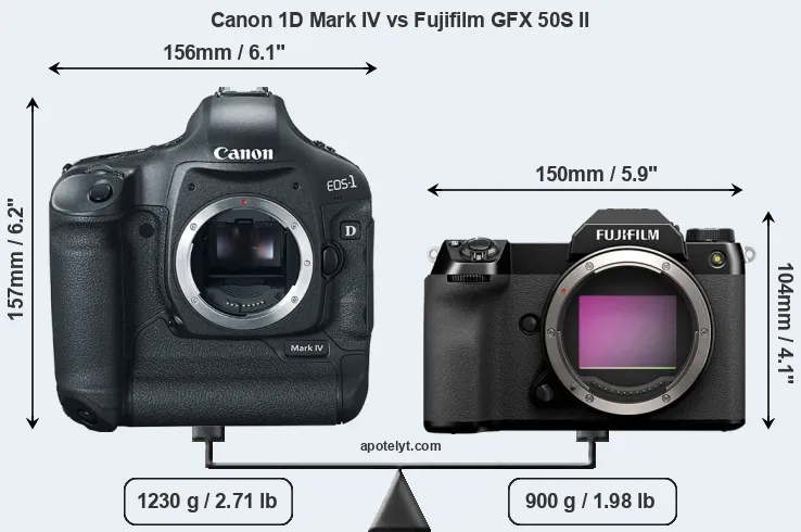 The side-by-side display below illustrates the physical size and weight of the Canon 1D Mark IV and the Fujifilm GFX 50S II. The two cameras are presented according to their relative size. Three successive views from the front, the top, and the rear are shown. All width, height and depth measures are rounded to the nearest millimeter.