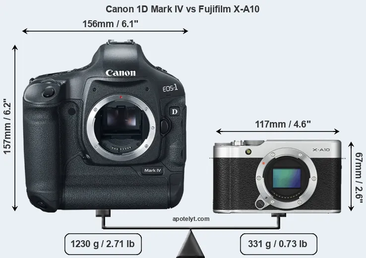 An illustration of the physical size and weight of the Canon 1D Mark IV and the Fujifilm X-A10 is provided in the side-by-side display below. The two cameras are presented according to their relative size. Three consecutive perspectives from the front, the top, and the back are available. All width, height and depth dimensions are rounded to the nearest millimeter.