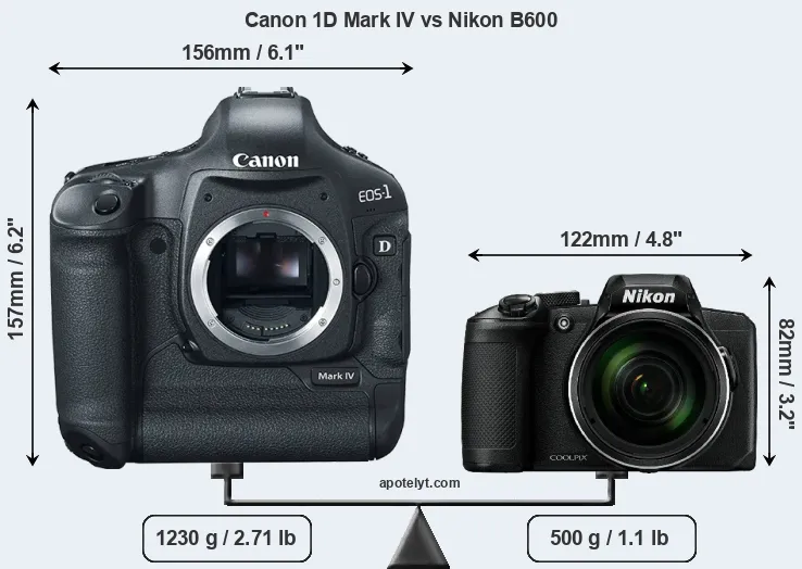 The physical size and weight of the Canon 1D Mark IV and the Nikon B600 are illustrated in the side-by-side display below. The two cameras are presented according to their relative size. Three successive views from the front, the top, and the rear are shown. All width, height and depth measures are rounded to the nearest millimeter.