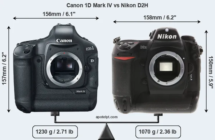 The side-by-side display below illustrates the physical size and weight of the Canon 1D Mark IV and the Nikon D2H. The two cameras are presented according to their relative size. Three consecutive perspectives from the front, the top, and the back are available. All size dimensions are rounded to the nearest millimeter.