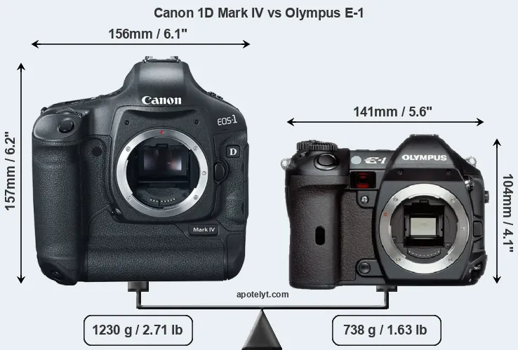 An illustration of the physical size and weight of the Canon 1D Mark IV and the Olympus E-1 is provided in the side-by-side display below. The two cameras are presented according to their relative size. Three consecutive views from the front, the top, and the rear side are shown. All width, height and depth measures are rounded to the nearest millimeter.