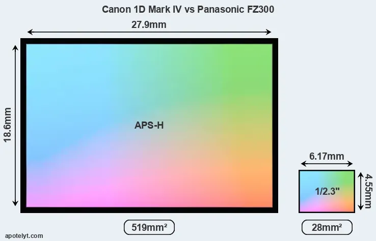 Of the two cameras under consideration, the Canon 1D Mark IV features an APS-H sensor and the Panasonic FZ300 a 1/2.3-inch sensor. The sensor area in the FZ300 is 95 percent smaller. As a result of these sensor size differences, the cameras have a format factor of, respectively, 1.3 and 5.6. The sensor in the 1D Mark IV has a native 3:2 aspect ratio, while the one in the FZ300 offers a 4:3 aspect.
