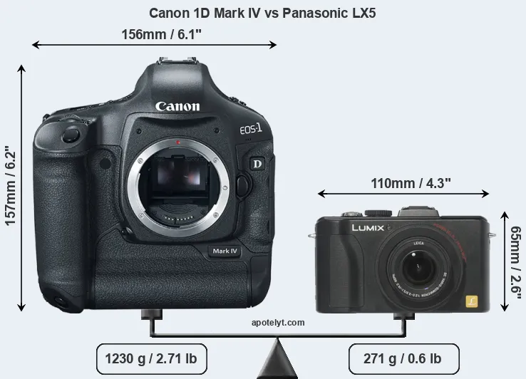 An illustration of the physical size and weight of the Canon 1D Mark IV and the Panasonic LX5 is provided in the side-by-side display below. The two cameras are presented according to their relative size. Three consecutive views from the front, the top, and the rear side are shown. All width, height and depth dimensions are rounded to the nearest millimeter.